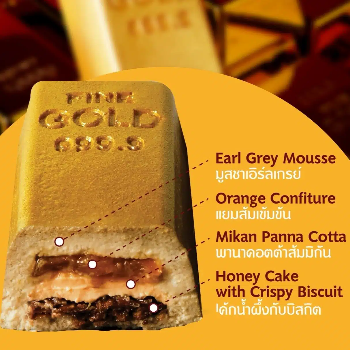 NEW! 2 เมนูทองคำ ไฮไลต์ของเมนูมงคลในปีนี้ คือการหยิบแรงบันดาลใจจาก “ทองคำ” ซึ่งในความเชื่อสื่อถึงความมั่งคั่งร่ำรวย ความอุดมสมบูรณ์ และความมั่งมีศรีสุข มาใช้เป็นแนวคิดในการรังสรรค์เมนูพิเศษ เริ่มที่ Gold Bar Cake เค้ก “ทองคำแท่ง” สื่อความหมายของเงินทองไหลมาเทมา มีกินมีใช้ ซ่อนความอร่อยไว้ถึง 4 เลเยอร์ รสส้ม ‘มิกัน’ และกลิ่นชา Earl Grey หอมนวล เหมาะทั้งสำหรับไหว้เจ้าและมอบเป็นของขวัญในช่วงเทศกาลตรุษจีน เพียง 550 บาท และ Ingot Nama Chocolate ‘กิมตุ้ง’ นพเก้า นามะช็อกโกแลตสดสูตรฮอกไกโด จากโกโก้ Organic เข้มข้น 72% ขึ้นรูปเป็นกิมตุ้งหรือเหรียญทองคำอันล้ำค่า ถ่ายทอดความหมายของความมั่งคั่ง ความเจริญรุ่งเรือง และร่ำรวย ส่งมอบในกล่องของขวัญ 9 ชิ้น เพียง 420 บาท